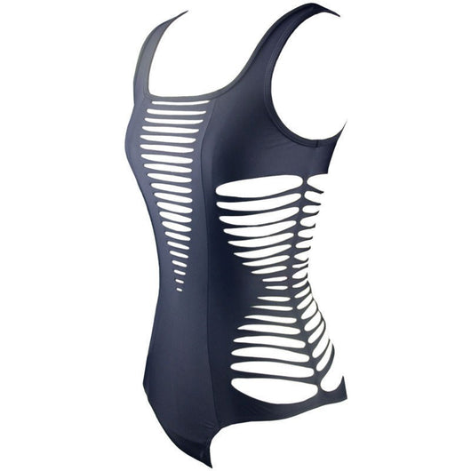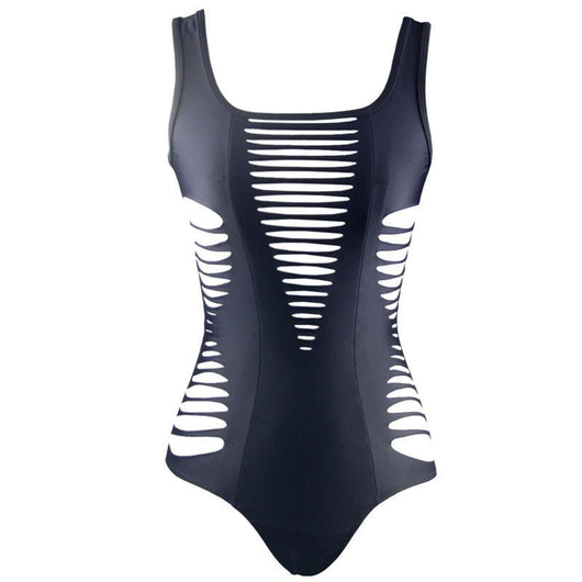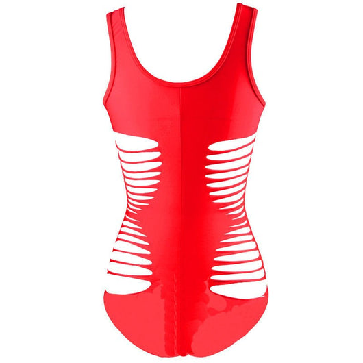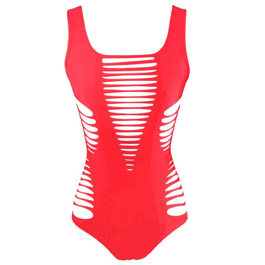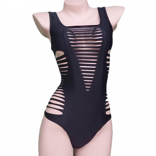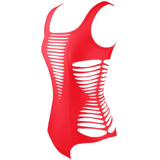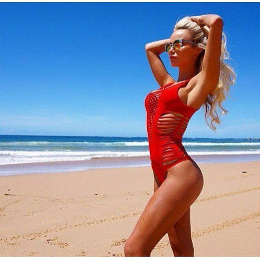 This one piece has parallel strings holding it together down the plunge in front, and all the way around the sides and back. This is a truly seductive one piece.
