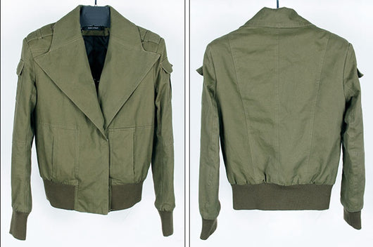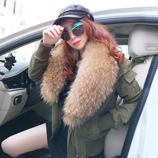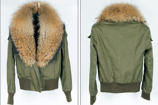Army themed bomber jacket with a lush raccoon fur collar. The collar is removable. Outer shell is cotton canvas in green. Length is around 23".
